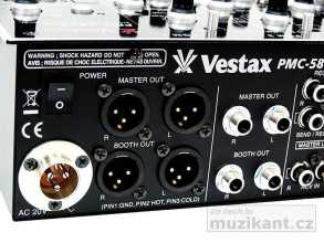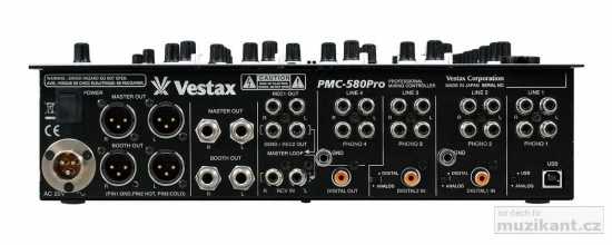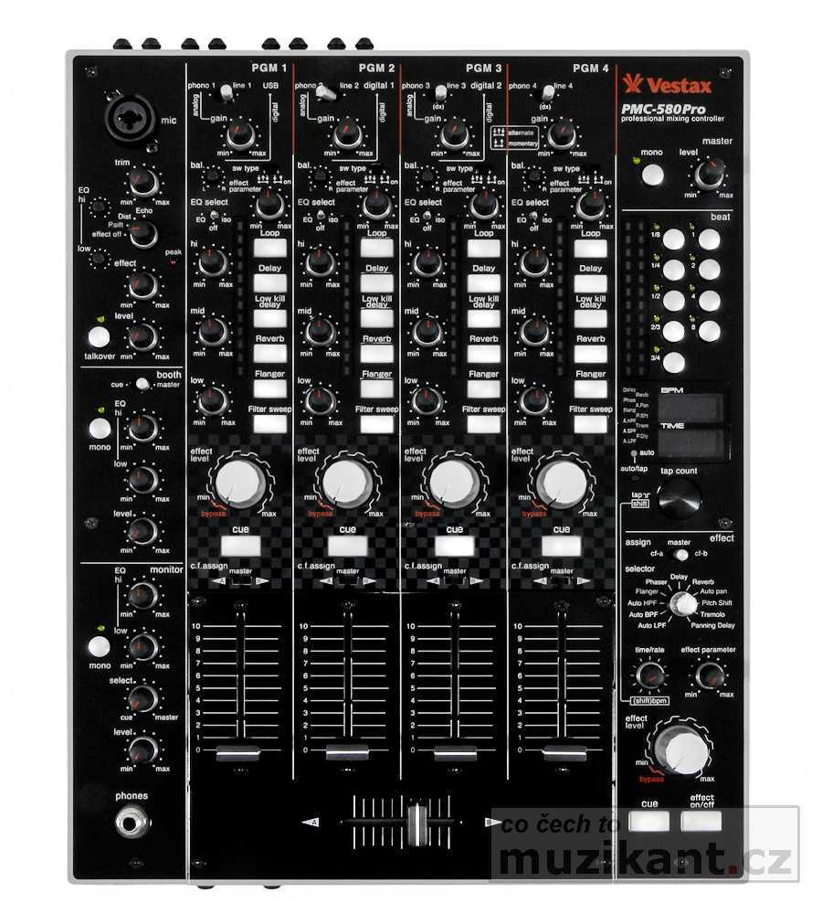 Digitální mixážní pult Vestax PMC-580Pro patří do rodiny klubových mixpultů stejně jako modely PMC-500 a PMC-CMX. Srdcem digitálního mixážního pultu PMC-580Pro je 5 DSP čipů a 3 CPU. Špičková technologie analogově-digitálních převodníků EDB ASAHIKASE zajišťuje kvalitní konverzi audio signálu v technologicky nových AD/DA převodnících s vysokým dynamickým rozsahem (24-bit E-Dual/ 48kHz). Samotný proces mixáže v digitálním pultu zajištují dva samostatné výkonné 32-bit DSP procesory. Každý ze čtyřech kanálů je vybaven otočnými potenciometry, regulující úroveň vstupního signálu, polohovými přepínači vstupního signálu (phono / line) a indikátory vstupního digitálního signálu. Dále třípásmovými korekcemi a přepínači ekvalizace - EQ (±12dB), off, nebo úplné potlačení pásma -ISOlator (−∞/+10 dB). Každý kanál má nastavení panorama (BAL) a dále je zde umístěno šest nízkozdvihových prosvětlených tlačítek digitální efektové jednotky. Každému tlačítku je přiřazen jeden efekt, který je plně řízen parametrickým otočným potenciometrem, umístěným nad touto sekcí a velkým otočným ovladačem, určeným k dynamické regulaci úrovně zvoleného efektu. Současně lze na celém mixážím pultu najednou použít až 6 efektů v reálném čase. Tlačítka těchto efektů pracují ve dvou režimech; přepínačem (sw type) můžete zvolit, jestli chcete, aby efekt běžel pouze po tu dobu, po kterou tlačítko stisknete, nebo v režimu, kdy jedním stiskem efekt aktivujete a druhým stiskem jej deaktivujete. Další prosvětlená tlačítka nad 60mm vysoce přesnými tahovými fadery jednotlivých kanálů slouží k aktivaci příposlechu, pod nimi jsou přepínače přiřazení jednotlivých kanálů na vstupy A a B crossfaderu. Ten disponuje plynulým nastavením křivky průběhu crossfaderu a je typu CF-PCV. Také input 60mm fadery mají nastavitelný průběh křivky záběru. Pátý vstupní kanál mixážního pultu PMC-580Pro je určen pro mikrofon. Má regulaci úrovně vstupní citlivosti, otočné dvoupásmové korekce (±12dB), tři různé digitální efekty (změna +/−1 oktáva, echo, distortion efekt) s možností ovládání jejich parametrů a tlačítko ztišení talkover. K připojení mikrofonu slouží konektor Neutrik Combo.