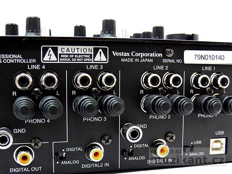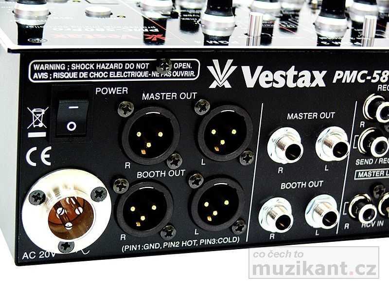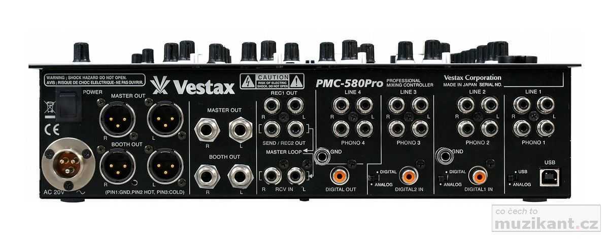 Výstupy mixážního pultu PMC-580Pro jsou samozřejmě digitální S/PDIF i analogové (symetrické XLR i nesymetrické 6,3mm Jack), dále je zde USB vstup / výstup a nesymetrické vstupy a výstupy (RCA) pro připojení externí efektové jednotky. Výstup mixu pro sluchátka (TRS 6,3) je vybaven dvoupásmovým EQ a přepínačem mono / stereo. Stejně tak druhý monitorový výstup BOOTH je vybaven dvoupásmovým EQ, přepínačem mono / stereo a je opatřen jak symetrickými (XLR) tak nesymetrickými (TRS 6,3) konektory. DJ si tedy může individuálně nastavit odlišnou barvu zvuku do sluchátek a jinou do příposlechových monitorů. Ke špičkové kvalitě zvuku mixážního pultu PMC-580Pro přispívá i oddělení napájecího zdroje; pult je napájen externím napájecím zdrojem 18V DC. Co se týče možnosti výměny faderů, je u mixpultu Vestax PMC-580Pro velmi jednoduchá; vyměnit lze všechny svislé fadery a samozřejmě i crossfader CF-PCV, který je na mixu továrně osazen. Digitální mixážní pult PMC-580Pro přináší uživatelům v segmentu klubových mixpultů nadstandardní komfort a vynikající kvalitu japonské značky Vestax. Ergonomie pultu je skvěle vyřešena, takže se vám se všemi ovládacími prvky pracuje pohodlně; uspořádání všech prvků na mixpultu je logické a přehledné. Další dobrá zpráva všem uživatelům se týká kvality. Narozdíl od konkurence, která své top pionýrské pulty stejné kategorie montuje kdesi v Malajsii, je mix PMC-580Pro (jak je u Vestaxu v této třídě mixpultů obvyklé), kompletně vyráběn v japonské továrně Vestax Corporation v Tokiu.